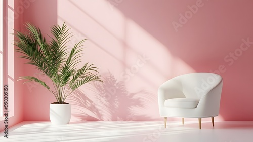 A serene room featuring a white chair and lush green plant against a soft pink wall, illuminated by natural light.