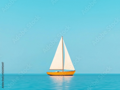 A serene sailing boat with white sails glides across calm blue waters under a clear sky.