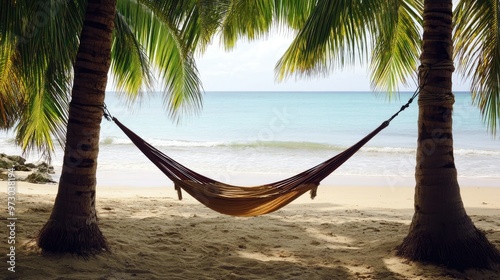 A serene scene of a hammock tied between two palm trees on a tropical beach, with soft waves lapping at the shore in the background.