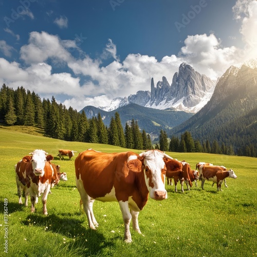A serene scene of a herd of cows peacefully grazing in a lush green field overlooked by majestic mountains in the background