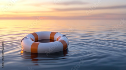 A serene scene of a life ring floating on calm water during a stunning sunset, evoking safety and tranquility.
