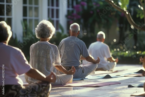 a serene scene of elderly people practicing yoga to reduce hypertension