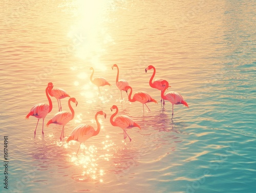 A serene scene of flamingos wading in shimmering water at sunset.