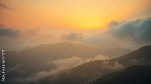 A serene scene of mountain peaks bathed in the soft orange glow of a sunrise with a sea of clouds stretching across the valley below.