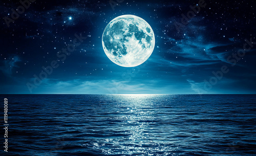A serene seascape featuring a bright full moon reflecting over calm waters.