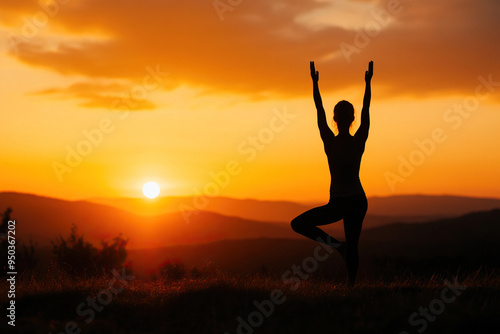 A serene silhouette of a person practicing yoga at sunset, radiating peace and tranquility amidst a beautiful landscape.