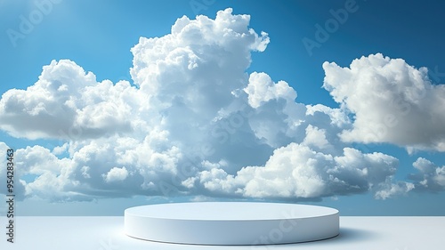 A serene sky featuring fluffy clouds over a circular platform, perfect for presentations or showcasing products.
