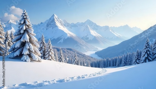 A serene snow landscape with trees and mountains in the background, a peaceful winter scene for backgrounds or seasonal concepts , seasonal, white
