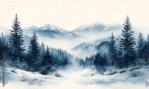 A Serene Snowy Landscape with Pine Trees and Falling Snow in Soft Watercolor Style Against a Light Gray Background, Evoking Calmness and Tranquility.