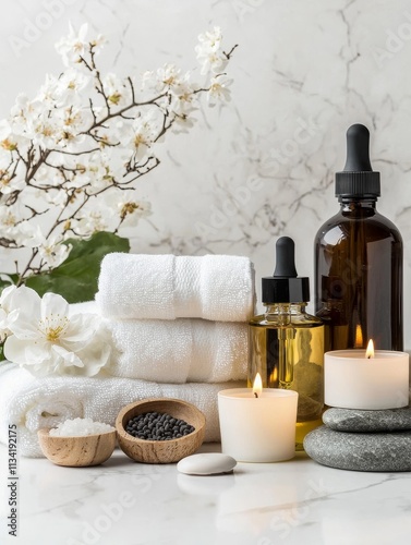 A serene spa arrangement featuring towels, essential oils, candles, and decorative flowers on a marble surface.