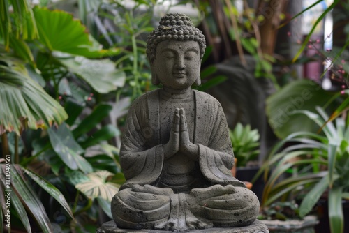 A Serene Stone Buddha Statue Amidst Lush Greenery in a Garden