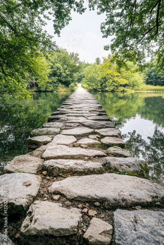 A serene stone pathway stretches across a calm lake, surrounded by lush green trees under a clear sky.
