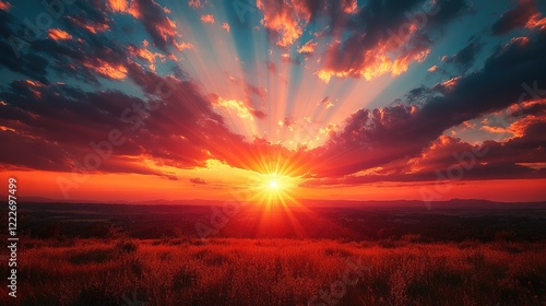 A serene sunrise scene featuring vibrant rays of sunlight radiating from the horizon,