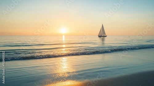 A serene sunset at the beach with a sailboat gliding over calm waters, creating a tranquil and picturesque atmosphere.