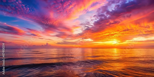 A serene sunset over a tranquil ocean with vibrant orange and pink hues, sunset, ocean, calm, tranquil, vibrant, orange, pink