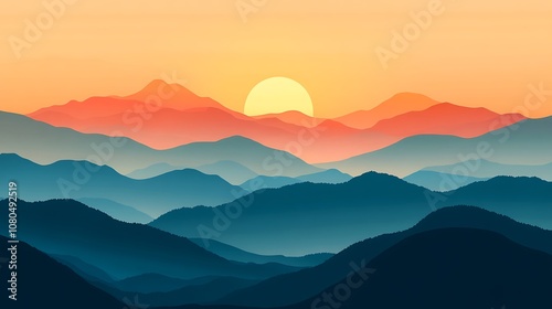 A serene sunset over layered mountains, showcasing gradient colors and a peaceful atmosphere.