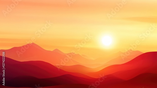 A serene sunset over rolling hills, displaying vibrant shades of orange and pink. The sun casts a warm glow across the peaks, creating a tranquil and breathtaking scene.