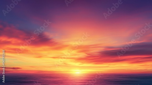 A serene sunset over the ocean, with vibrant hues of orange, purple, and pink reflecting on the water's surface.