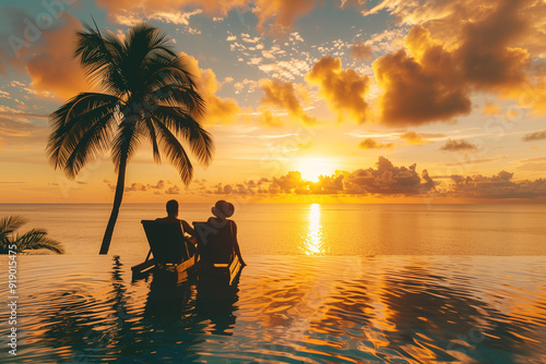 A Serene Sunset Scene at a Luxury Tropical Resort with a Couple Relaxing by an Infinity Pool Overlooking the Ocean