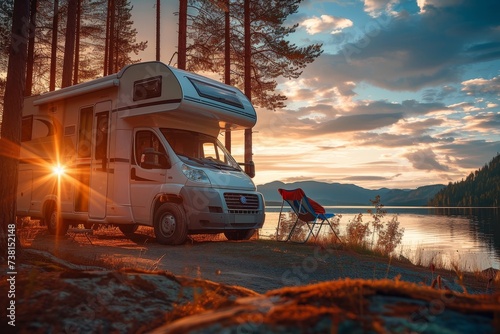 A serene sunset view of a camper van parked by the lake with empty chairs beckoning the beauty of outdoors and adventure