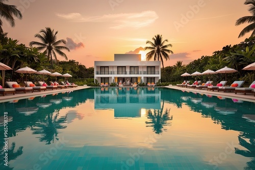 A serene sunset view of the luxury hotel's reflection on the calm surface of a turquoise swimming pool,
