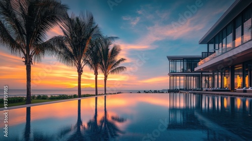 A serene sunset view over a luxurious infinity pool by the ocean, surrounded by palm trees.