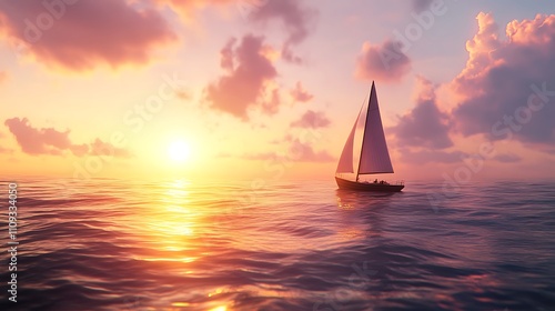 A serene sunset view with a sailboat gliding across calm waters.