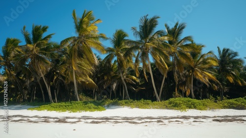 A serene tropical beach with swaying palm trees, golden sand, and a clear blue sky, basking in the warmth of hot weather.