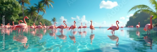 A serene tropical scene featuring vibrant pink flamingos wading in crystal-clear waters, surrounded by lush palm trees and a bright blue sky. ideal for nature and travel themes.