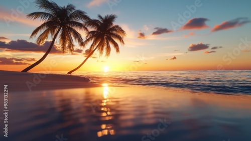 A serene tropical sunset featuring palm trees beside calm waters, creating a peaceful beach atmosphere.
