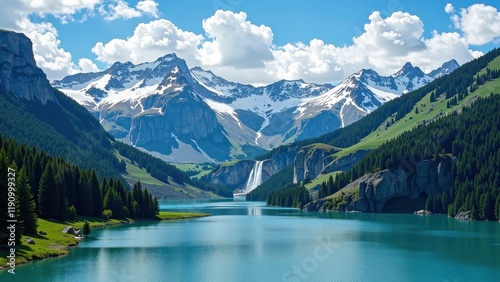A serene turquoise lake nestles amidst lush green mountains, crowned by snowy peaks. A majestic waterfall cascades into its heart while a soft, azure sky embraces the tranquil scene