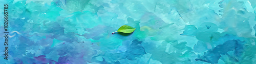 A serene turquoise wallpaper featuring a small green leaf floating lazily in the center, surrounded by various shades of blue and purple watercolor brushstrokes.