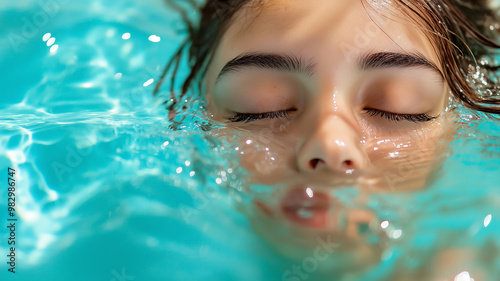 A serene underwater image of a young person with eyes closed, surrounded by shimmering water.