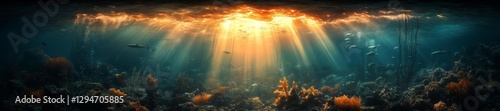A serene underwater view with sunbeams illuminating coral and sea life. Generative AI