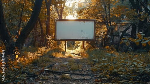 A serene urban nature reserve with walking trails and a vertical blank white screen billboard mock-up. full ultra HD, high resolution.