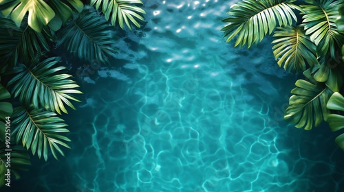 A serene view of a clear blue pool with sunlight reflecting on the water and palm leaves casting shadows