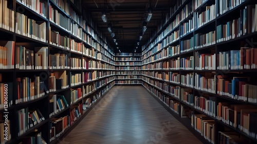 A serene view of a library aisle, showcasing rows of books on shelves, inviting exploration and learning in a quiet environment.