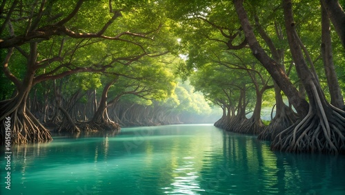 A serene view of a river flowing through a lush green forest with trees lining the banks and roots visible