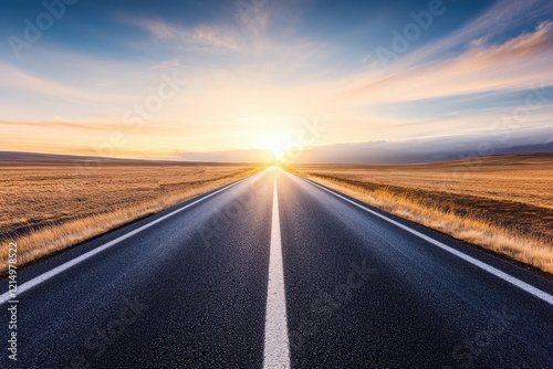 A serene view of an open road leading towards a vibrant sunrise, surrounded by vast fields and a clear sky.