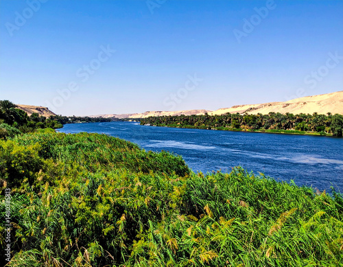 A serene view of the Nile River surrounded by vibrant green papyrus plants.