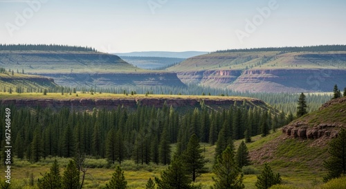 A serene vista of a valley with layered hills, vibrant green forests, and reddish rock formations.