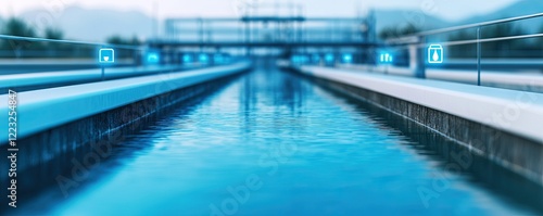 A serene water treatment facility with blue water channels, surrounded by modern infrastructure, showcasing the importance of water management.