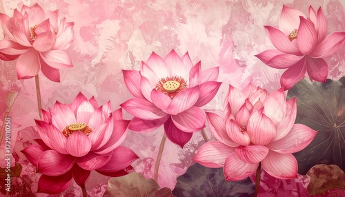 A serene watercolor of five vibrant, pink lotus blossoms with textured, abstract background. Detailed petals, stems, and leaves in warm tones