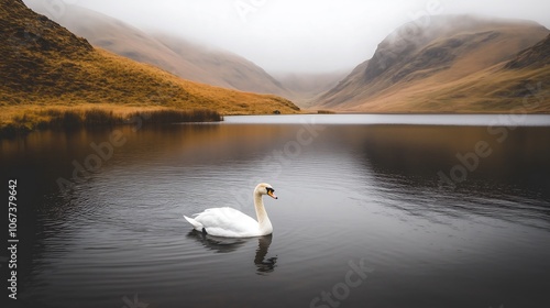 A serene white swan floating gracefully on a calm lake. The overall composition should evoke a sense of elegance and stillness.