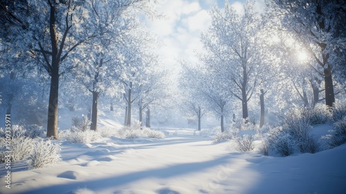 A serene winter landscape blanketed in soft, white snow under a bright blue sky.