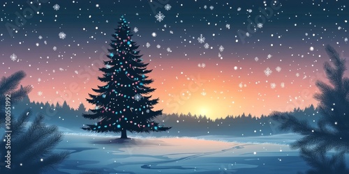 A serene winter landscape featuring a snow-covered pine tree adorned with colorful lights, set against a stunning sunset backdrop.