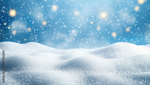 A serene winter landscape featuring a soft blanket of snow glistening under gentle snowfall. with blurred warm lights in the background creating a magical atmosphere