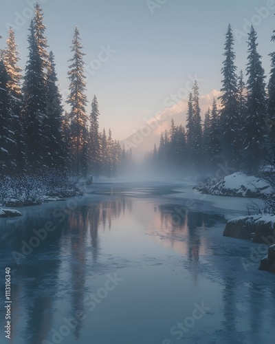 A serene winter landscape featuring a tranquil river surrounded by tall evergreen trees and snow-covered mountains, with soft morning light reflecting on the water.