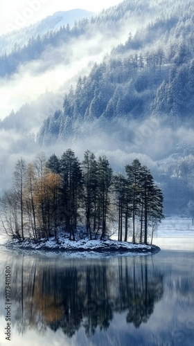 A serene winter landscape featuring an island with tree, tree, trees reflecting on a calm lake surrounded by mountains.