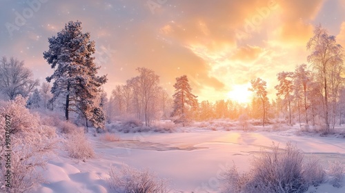 A serene winter landscape with a frozen lake and frosted trees, illuminated by a vibrant sunset.